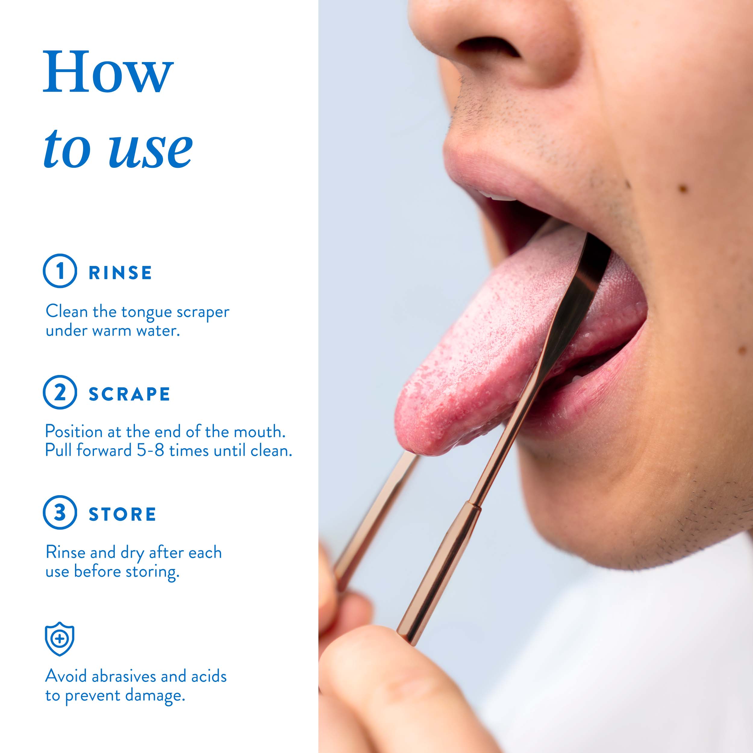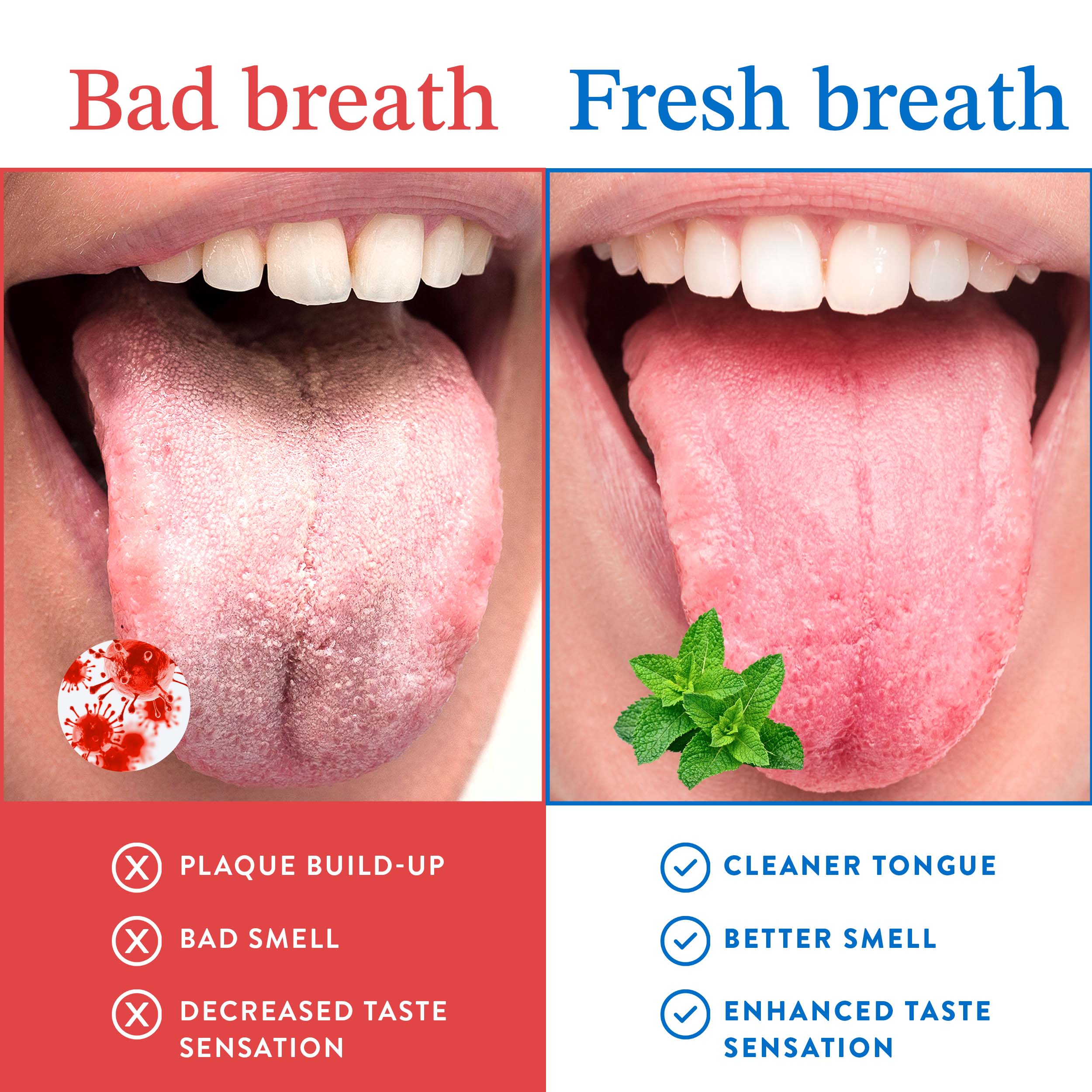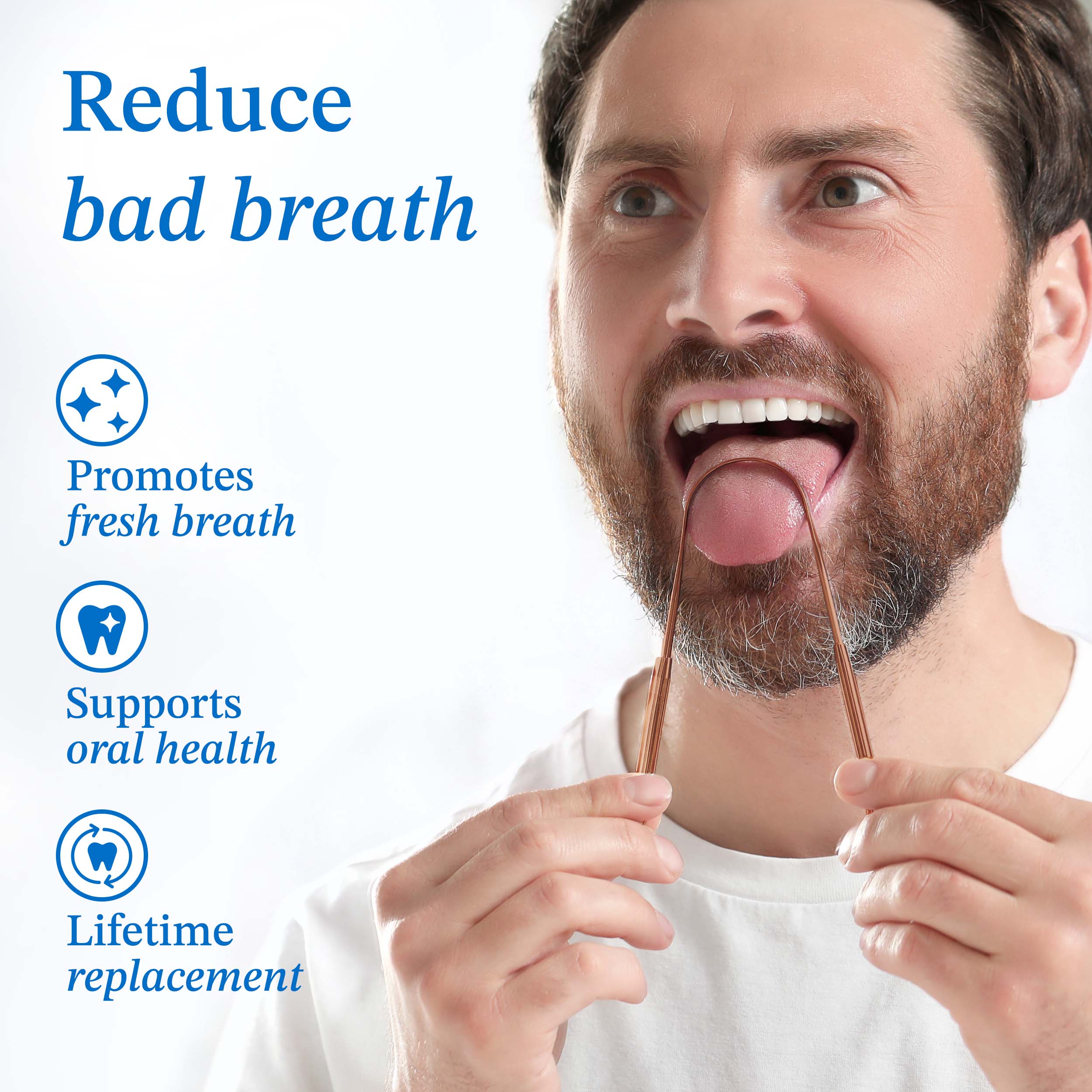 Removes the bacteria-filled film on your tongue that causes most bad breath. One scrape in the morning = confidence all day long.